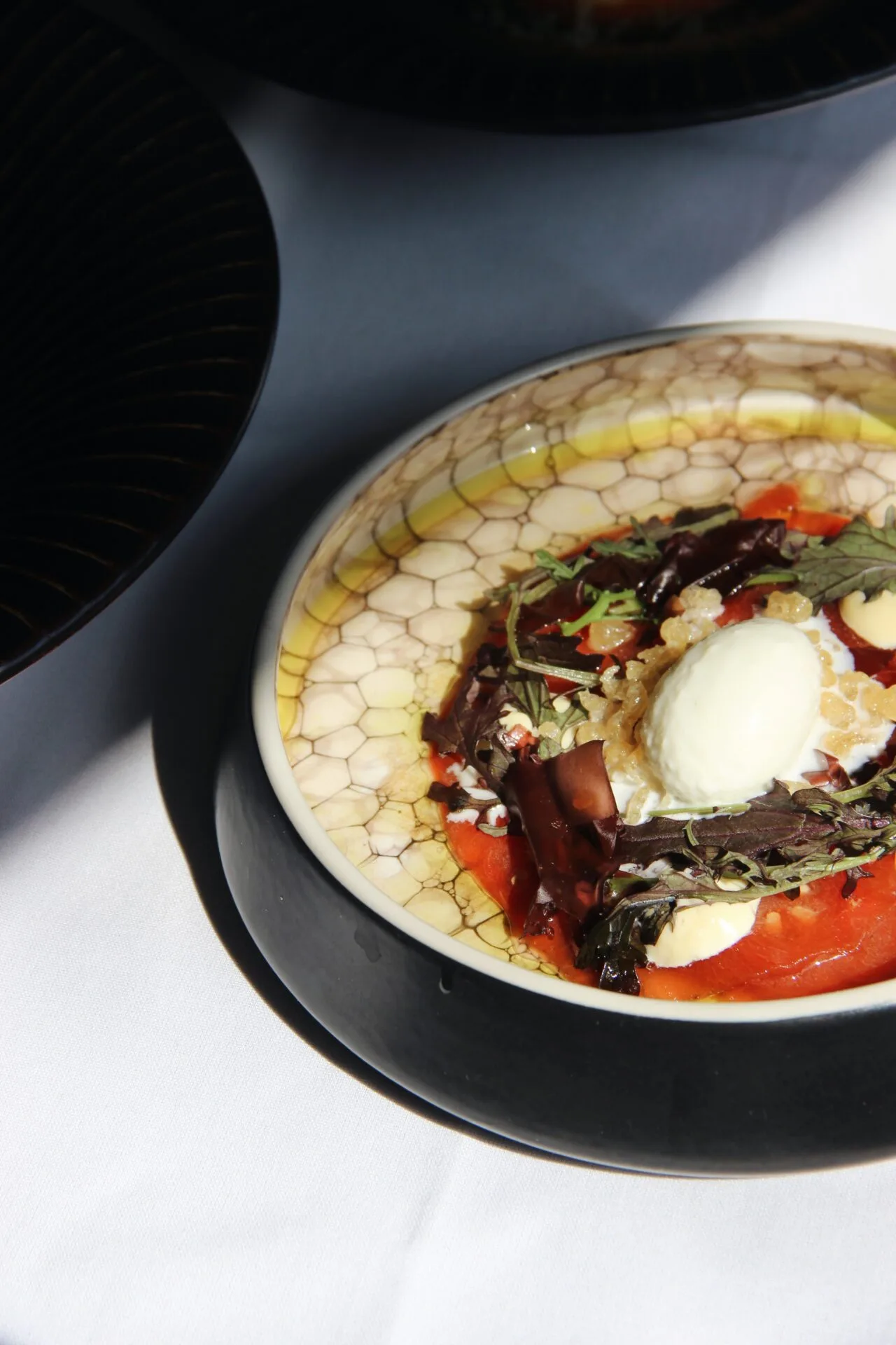 courgette | vadouvancrème | paddenstoel | waterkers | krokantje van gamba en sesam | visjus met groene peper